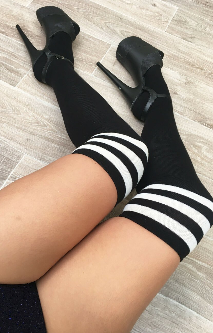 Sport luxe look stretch cotton knit thigh high socks. Perfect look worn with heels for that floorwerk!