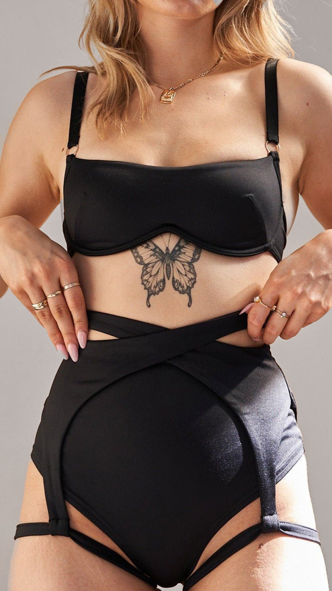 - Cross over waist detail with garter straps