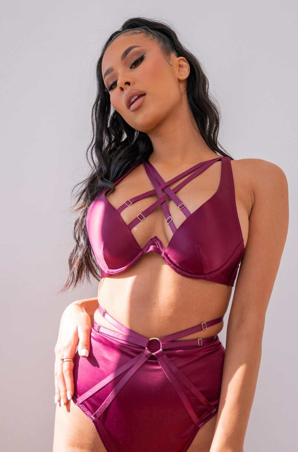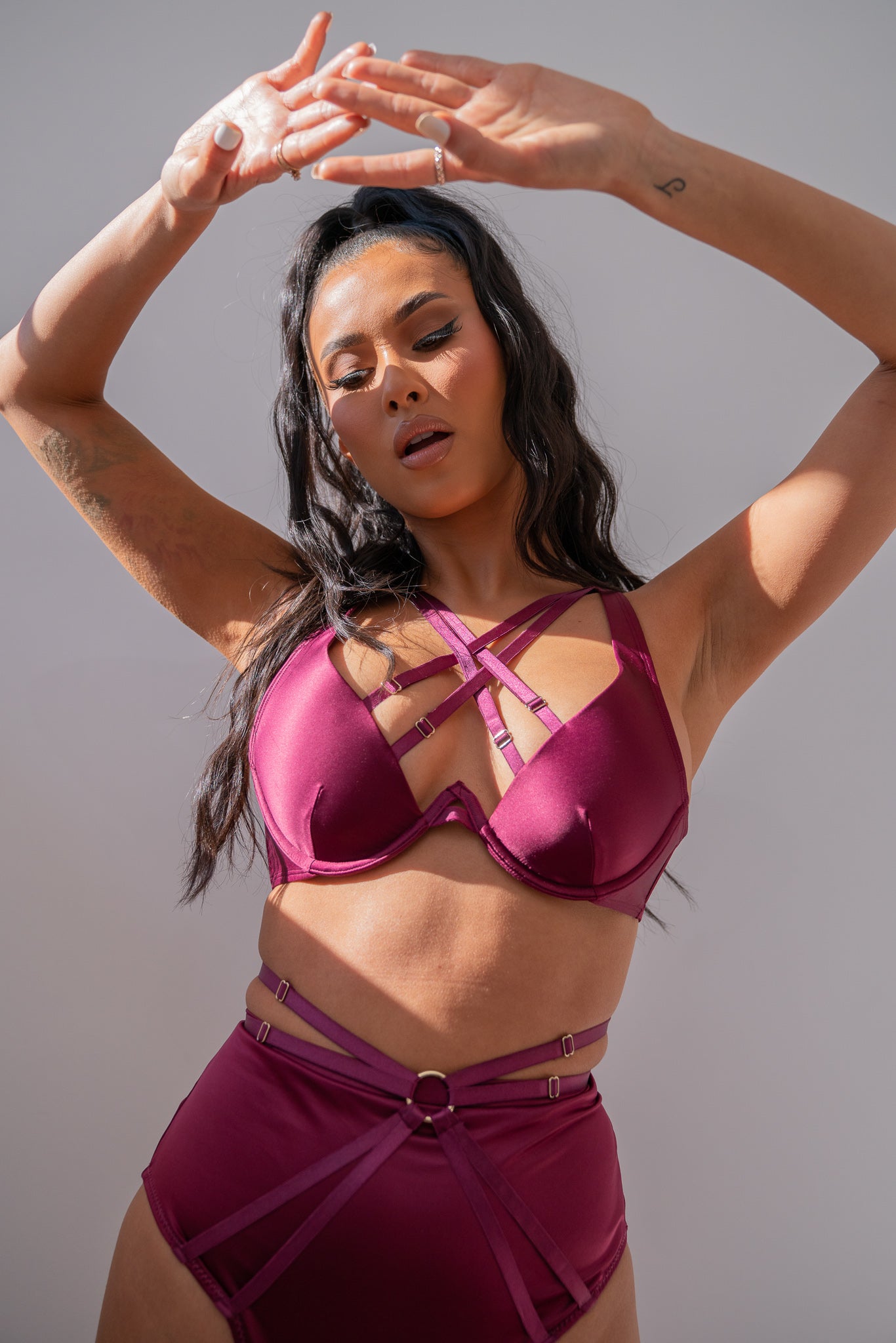 Captivate any audience in our Sofia bra. This plunge bra design, paired with straps that criss-cross over the chest will make sure all eyes are on you. The sumptuous sheen of this satin material adds extra luxury to this piece.